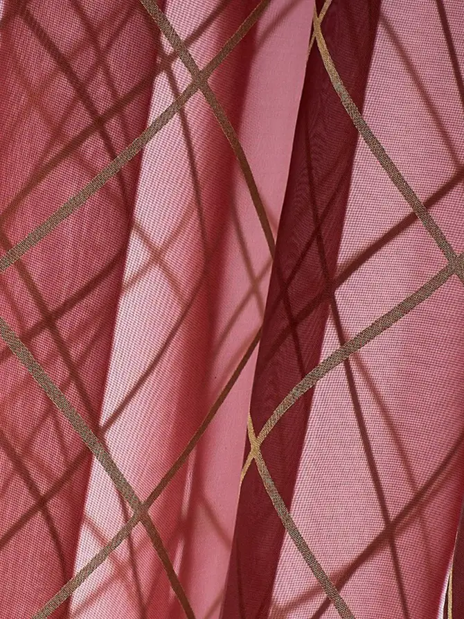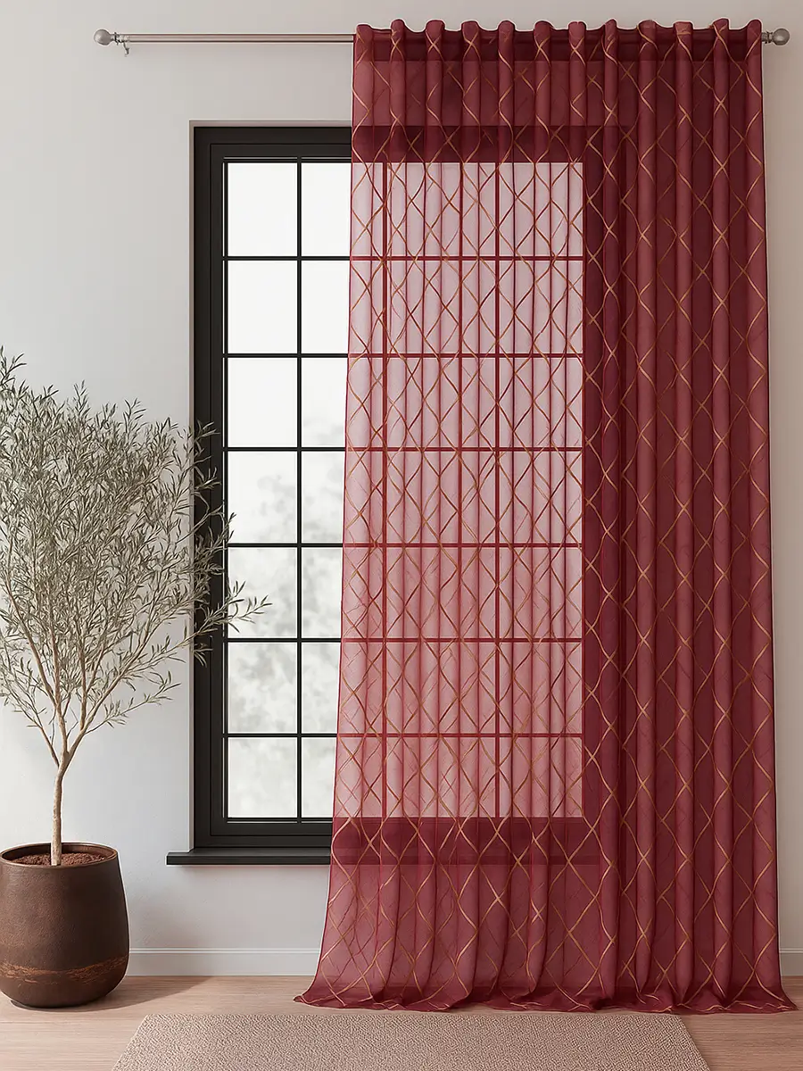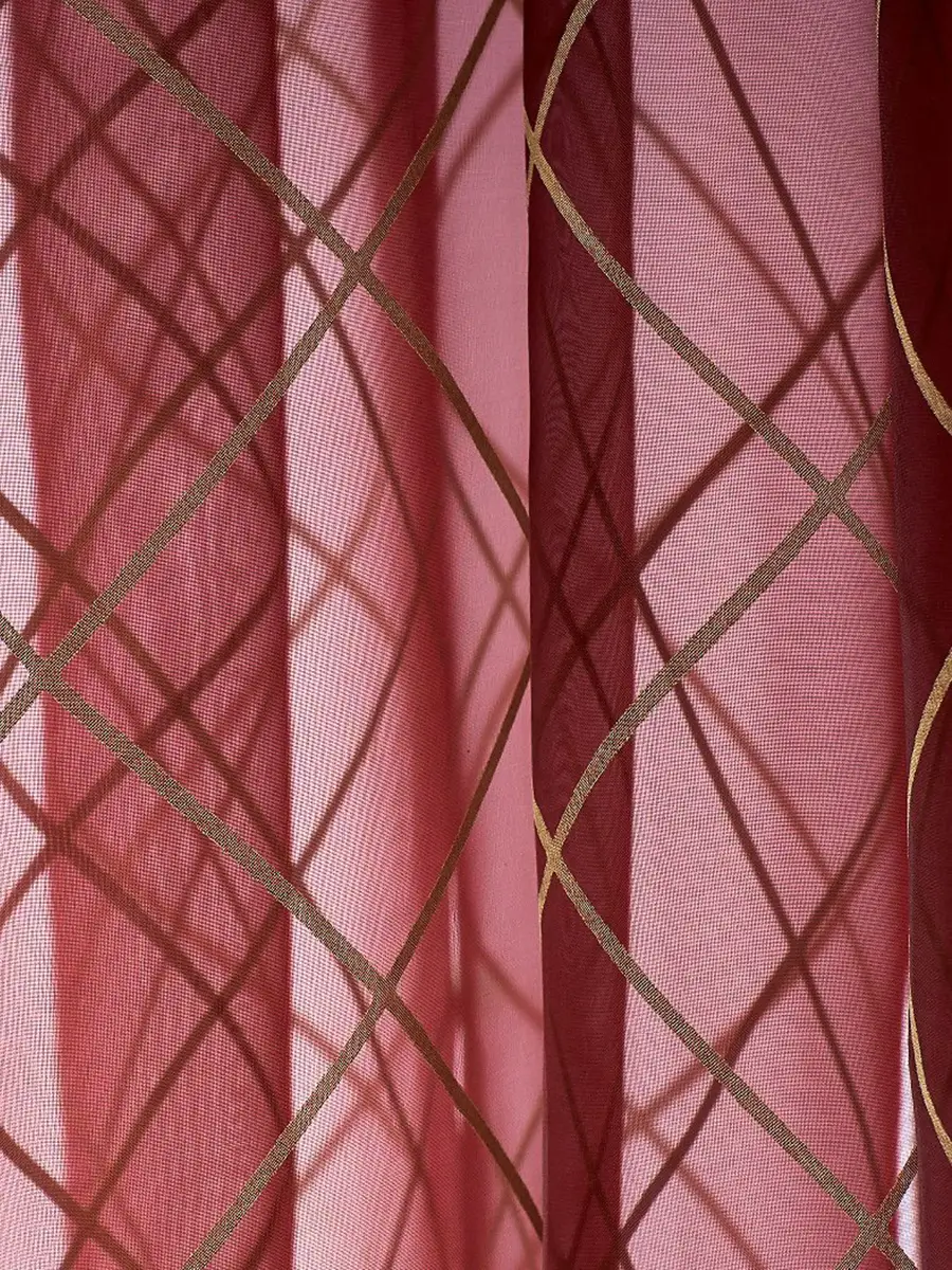Хотите обновить интерьер без капитального ремонта? Современная тюль в бордовом оттенке с изящным геометрическим узором — это простой и эффектный способ придать комнате индивидуальность. Тонкая структура органзы красиво пропускает свет, создавая уютное и элегантное пространство.