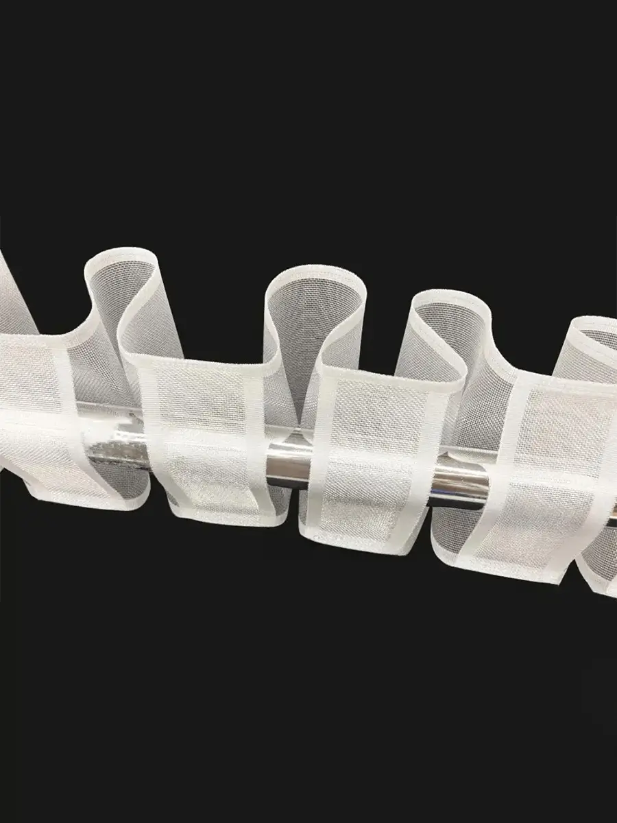 Шторная лента «Эффект люверсов» используется для пошива штор с красивой ровной сборкой, похожей на шторы на люверсах, но без отверстий и установки люверсов. Лента пришивается к верхнему краю полотна и помогает сформировать одинаковые складки по всей ширине.