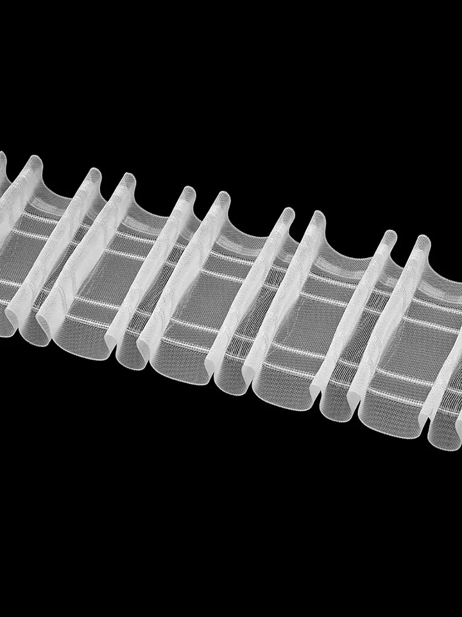 Лента имеет один ряд петель под крючки и петли для карниза-трубы. При стяжке формируются глубокие лучевые складки, которые хорошо держат форму.