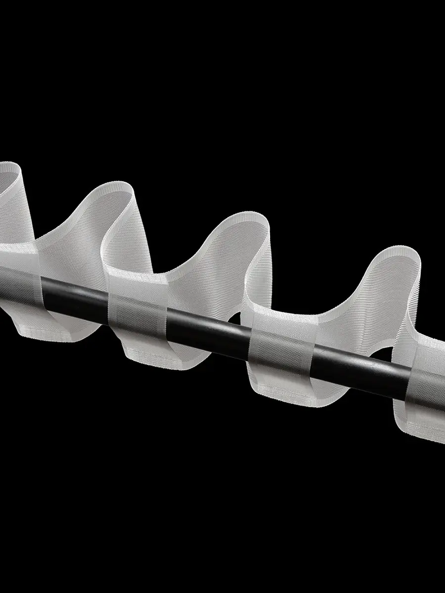 Ширина 10 см и плотная основа позволяют ленте уверенно держать форму, благодаря чему сборка получается стабильной и выразительной. Особенность этой модели — усиленные поперечные петли, которые выполнены из такого же плотного материала, как и сама лента. За счёт этого они не деформируются и при необходимости мягко скользят по круглому карнизу, позволяя легко двигать шторы.