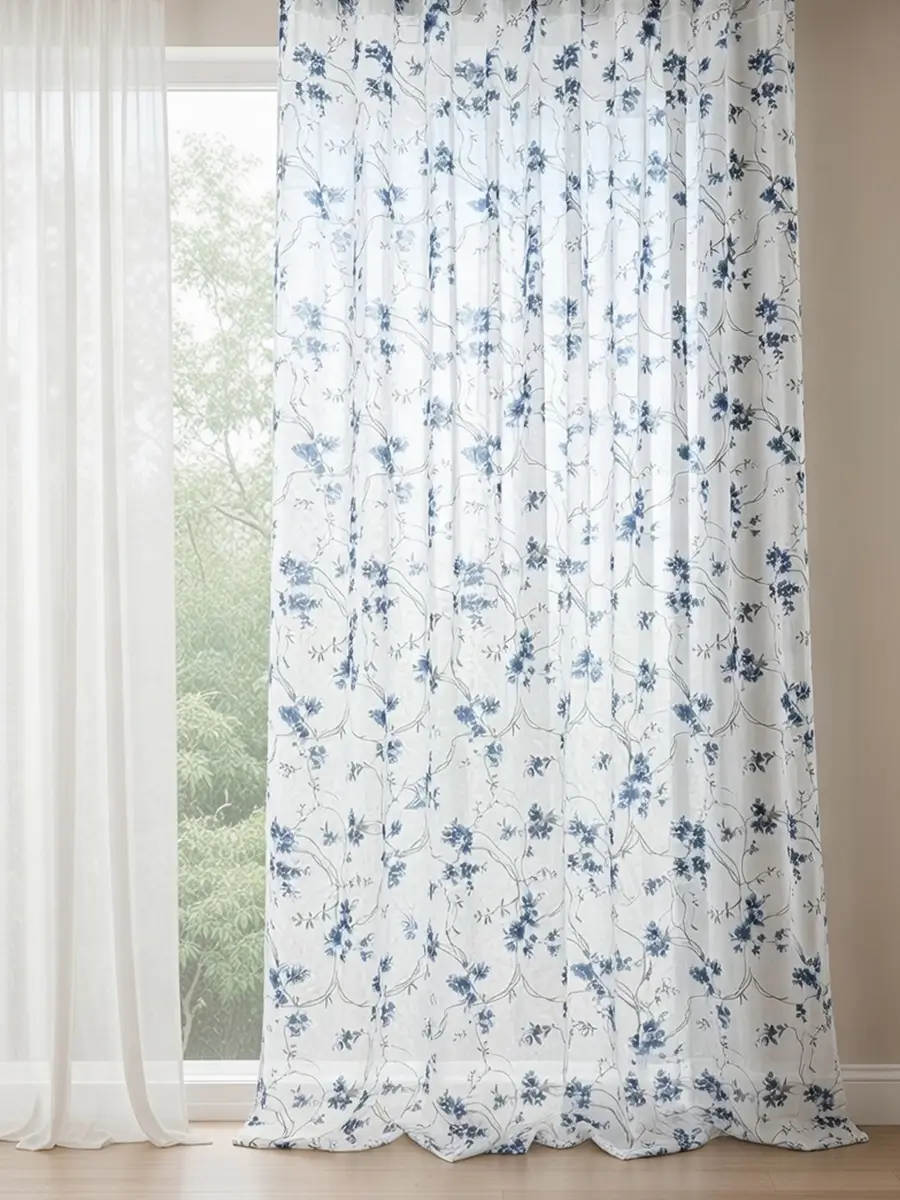 Хотите обновить интерьер быстро и недорого? Лучший способ — купить тюль онлайн, выбрав лёгкую модель с актуальным дизайном. Этот вариант с голубыми цветами отлично подойдёт для просторного зала, современной гостиной или даже спальни. Светлая ткань рассеивает свет, делая комнату уютной и визуально больше.