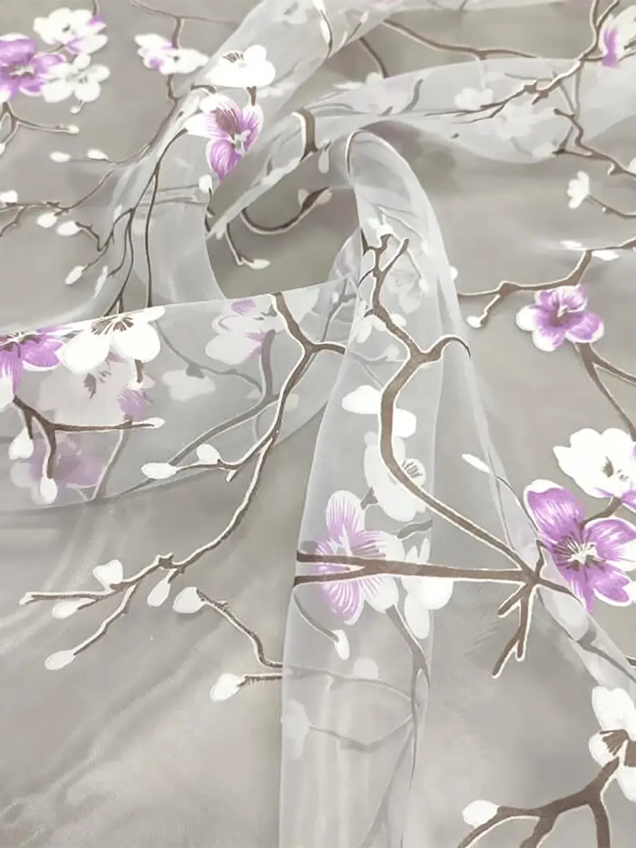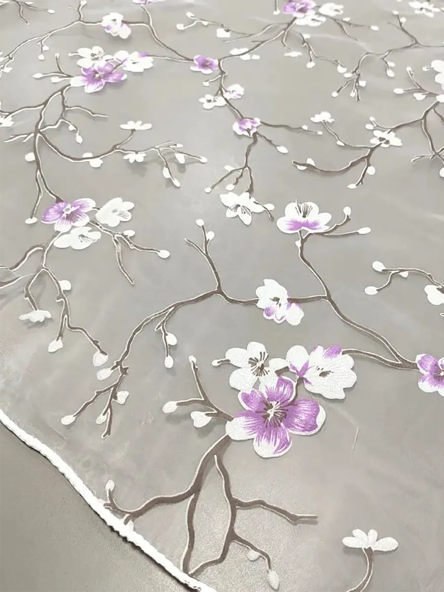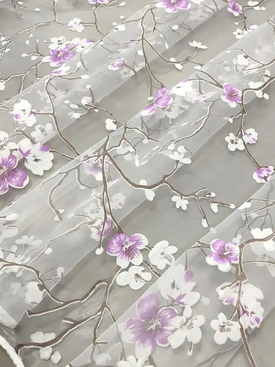 Тюль с узором сакуры — это ткань, которая добавляет интерьеру легкость и природную гармонию. Прозрачная основа украшена изящными ветками с цветами сакуры, выполненными в бело-сиреневых оттенках. Контрастные ветки и нежные цветы создают красивую декоративную композицию, которая делает оформление интерьера более выразительным и придает пространству особую атмосферу уюта и эстетики.