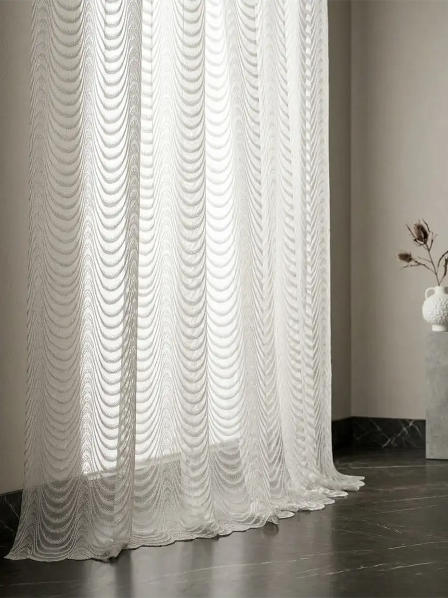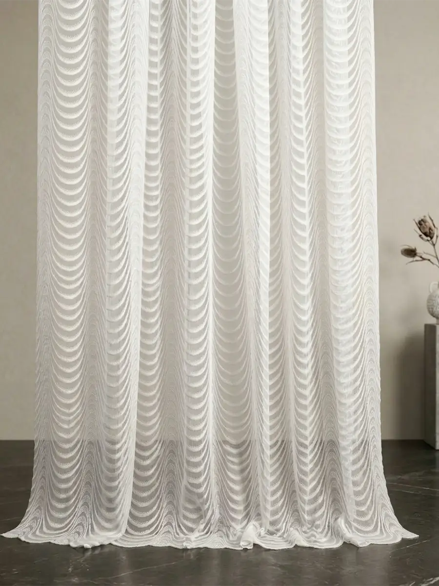 Белая тюль с рисунком волна гармонично смотрится в спальне, гостиной и кухне, легко сочетаясь со шторами и другими элементами текстиля. Лёгкая структура ткани красиво ложится складками и формирует аккуратные фалды на карнизе. Такая тюль подходит для оформления интерьера в современном, классическом и стиле лофт, создавая ощущение уюта и сохраняя комнату светлой.