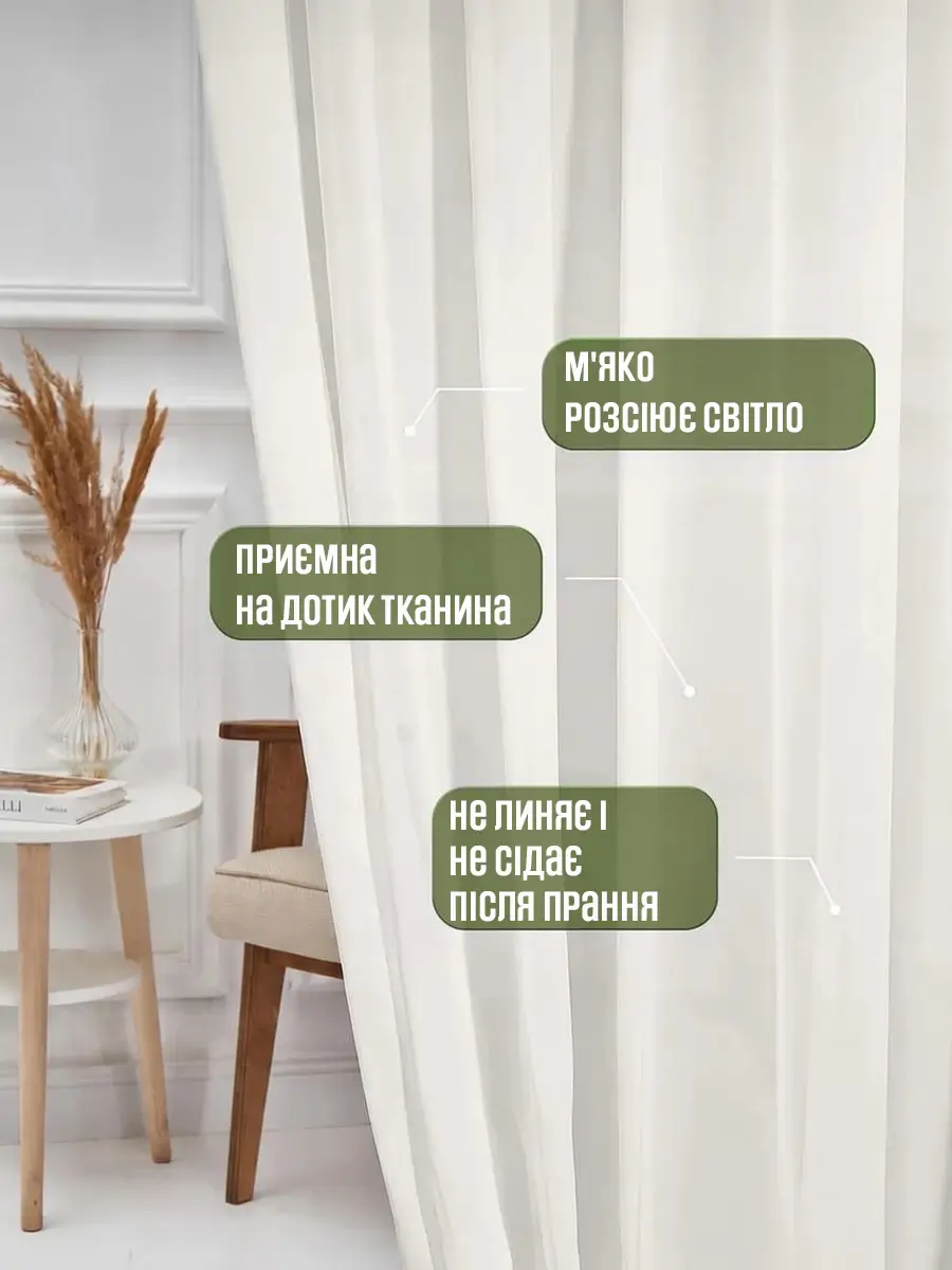 Так. Вуаль м'яко розсіює світло, красиво фільтрує сонячні промені та частково закриває огляд зовні, при цьому не затемняючи приміщення. Завдяки цьому в кімнаті зберігається відчуття легкості, затишку та світлого інтер'єру.