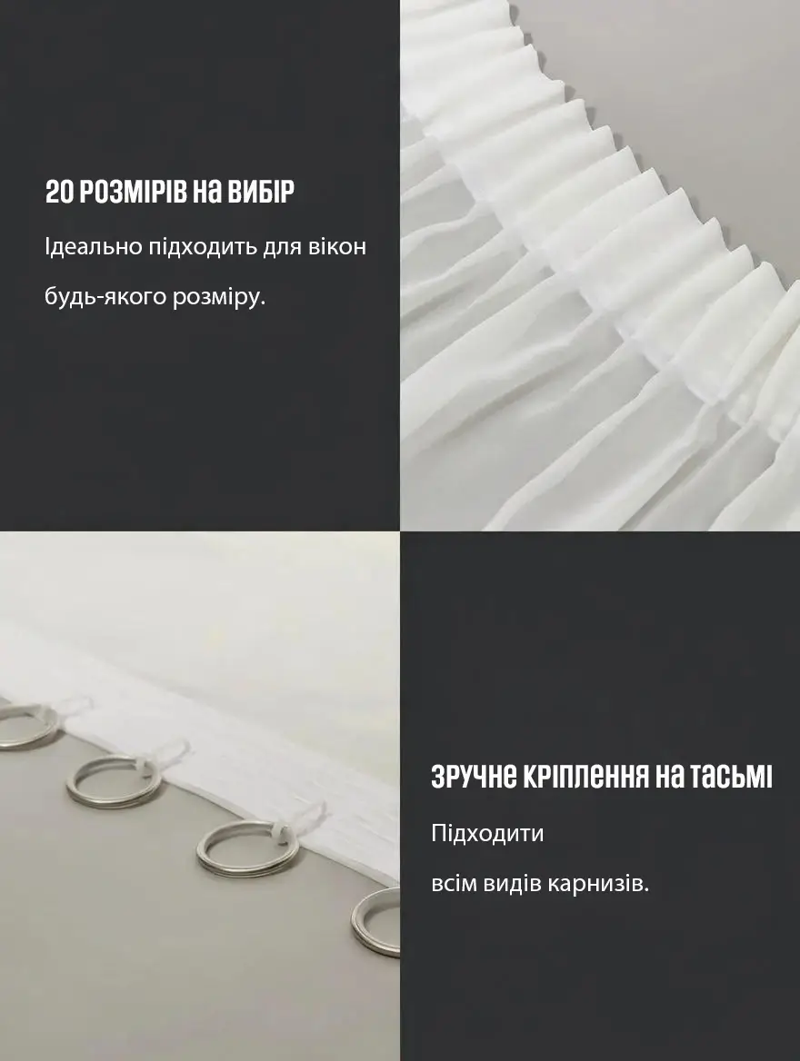 Тюль готова купити 400×270 на тасьмі – варіант для оформлення вікна в кімнаті або залі. Ширина 400 см формує м’які хвилі по карнизу і створює акуратний вигляд віконного отвору.