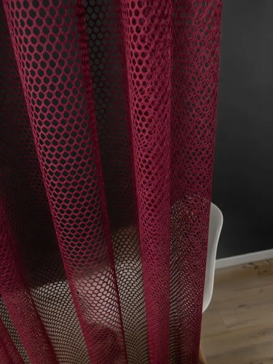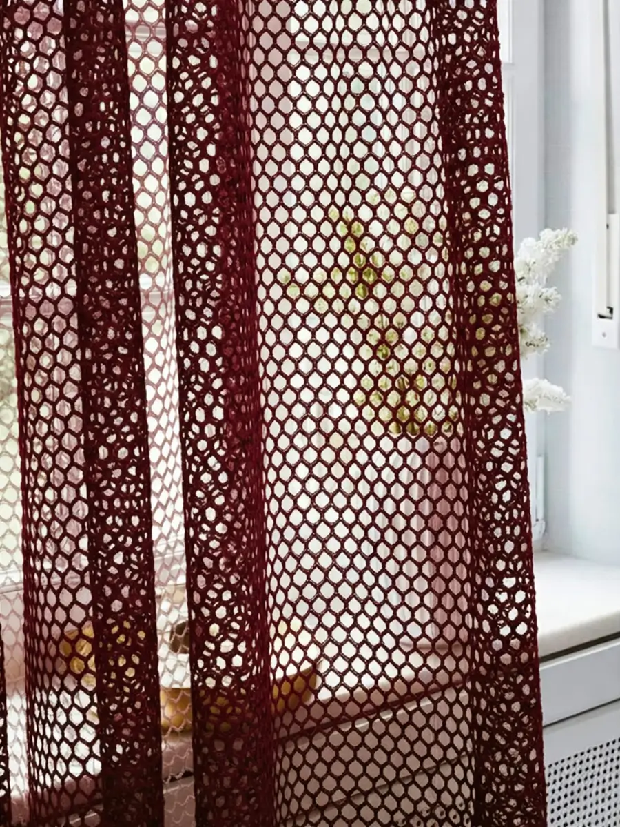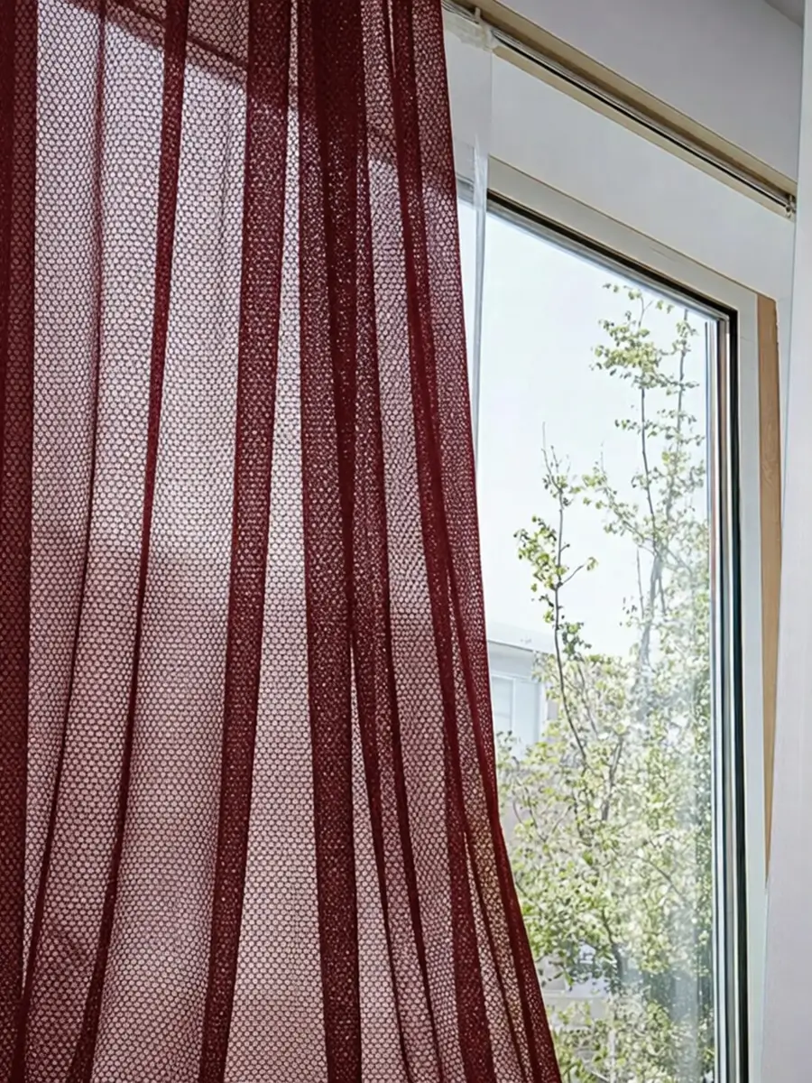 Тюль сетка бордо подходит для окон спальни и зала. Такой цвет помогает сделать интерьер более выразительным и хорошо сочетается со шторами разных оттенков.